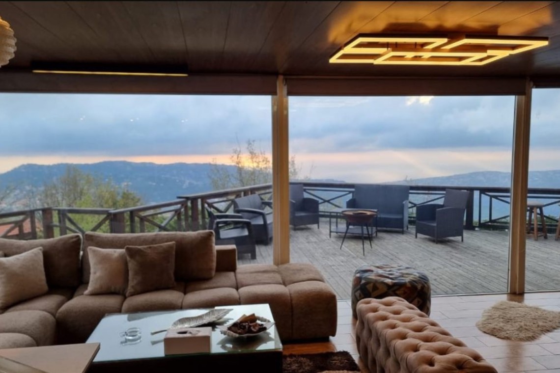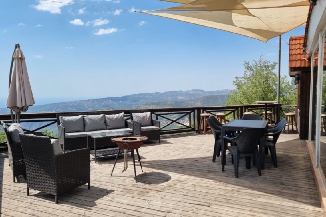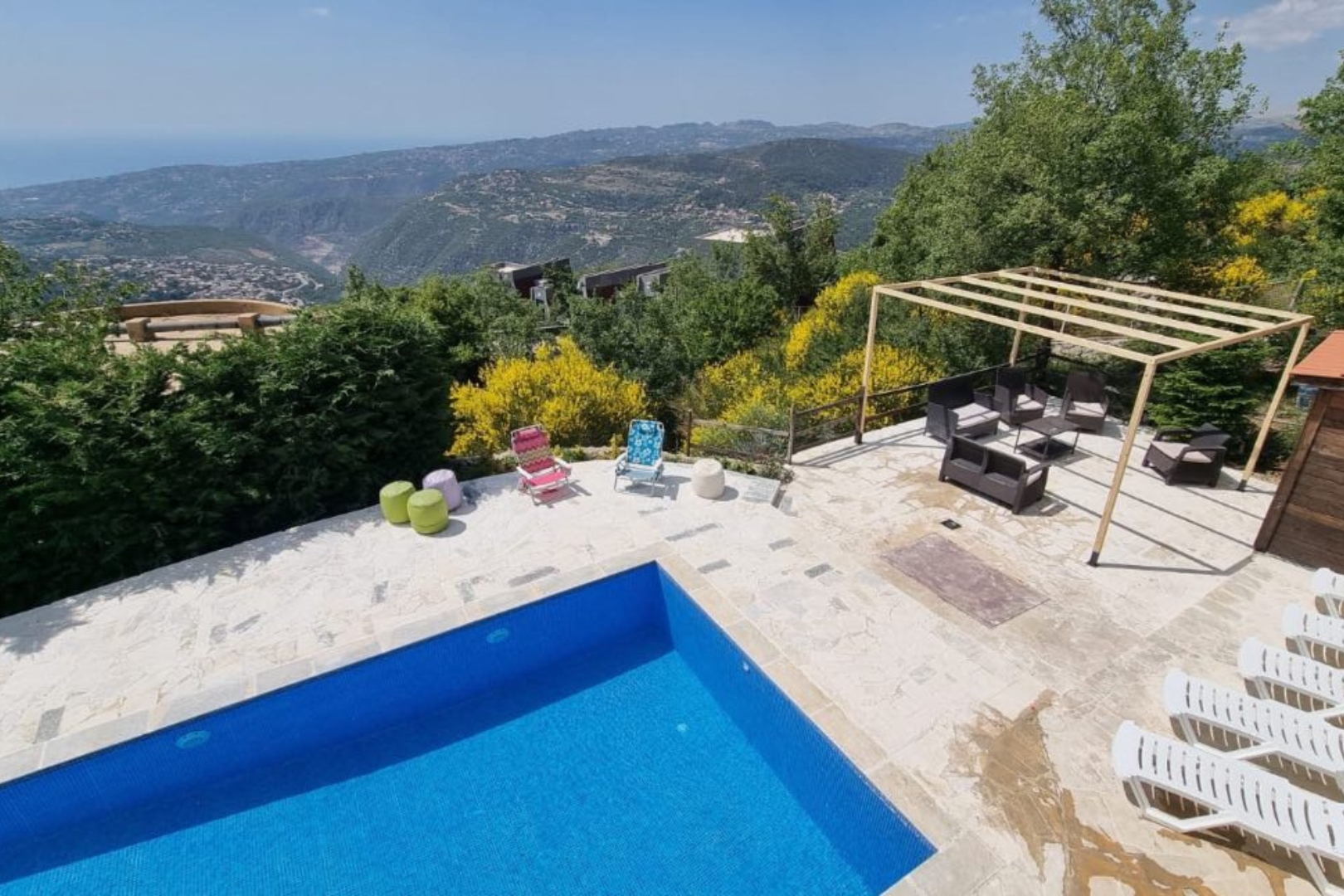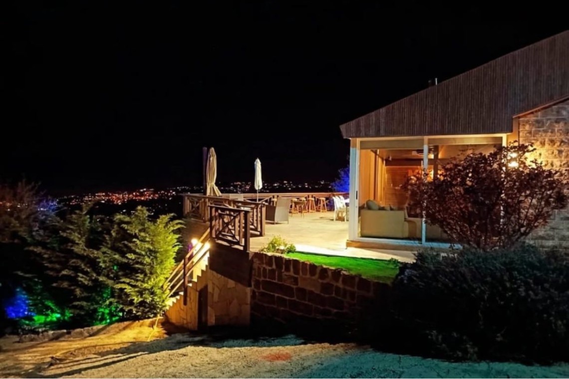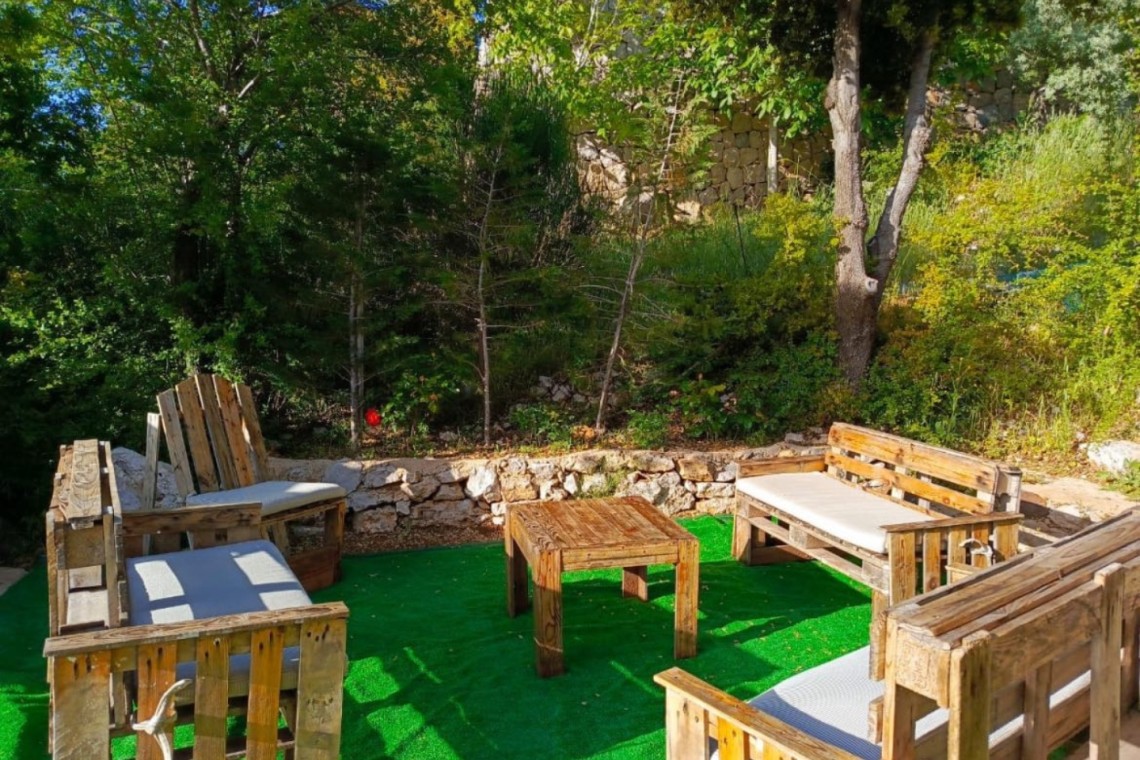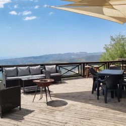 Outdoor private wooden terrace with lounges, high tables, high chairs, dining tables and chairs Private garden that has a huge private pool (built-in)